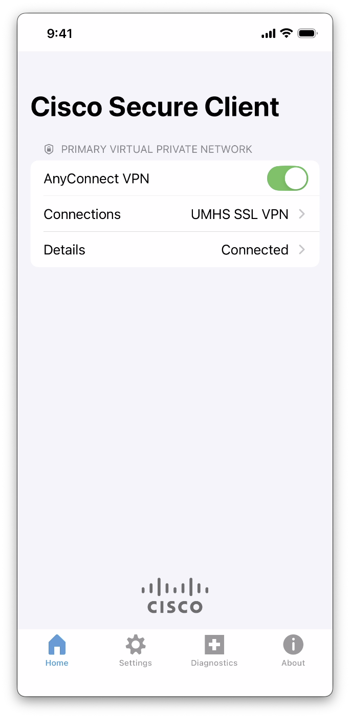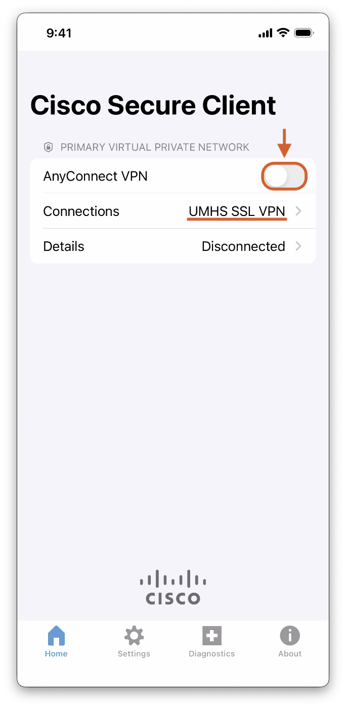 3. Ensure you are connecting to the UMHS SSL VPN, then tap the On/Off toggle