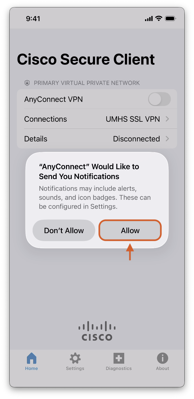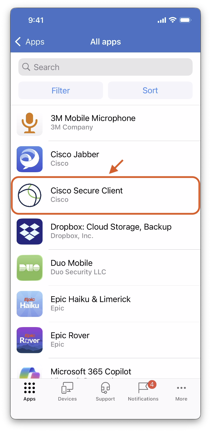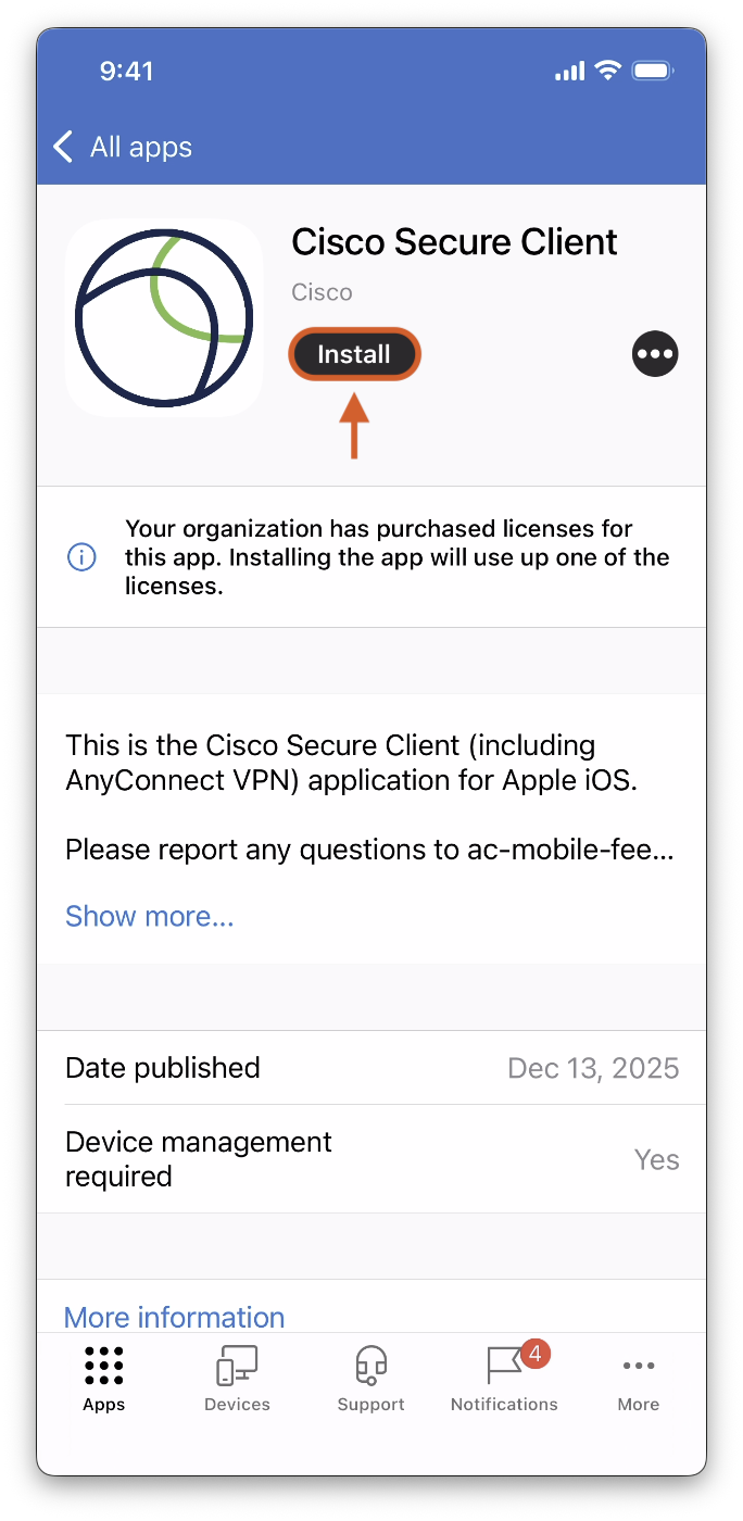 This article will walk you through installing and connecting to the Cisco Secure Client applcation on a Corporate owned iOS device.
