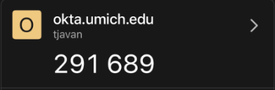 Open the Okta Verify app on your smartphone. The code is automatically generated for your account which should be labeled ''okta.umich.edu'' and have your uniqname listed underneath the label. Type this code in following the comma.