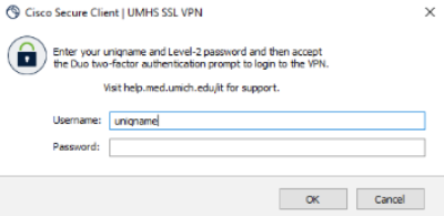 | 1 | Open Cisco Secure Client from your laptop. Enter your uniqname and Michigan Medicine password but DO NOT press enter or click OK yet. | |