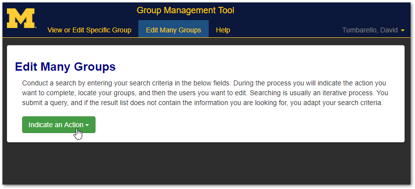 Note: The Edit Many Groups tab has several actions that permit you to upload a file for batch processing. This file must be either a .txt or a .csv file containing only one column, which is a list of Uniqnames.