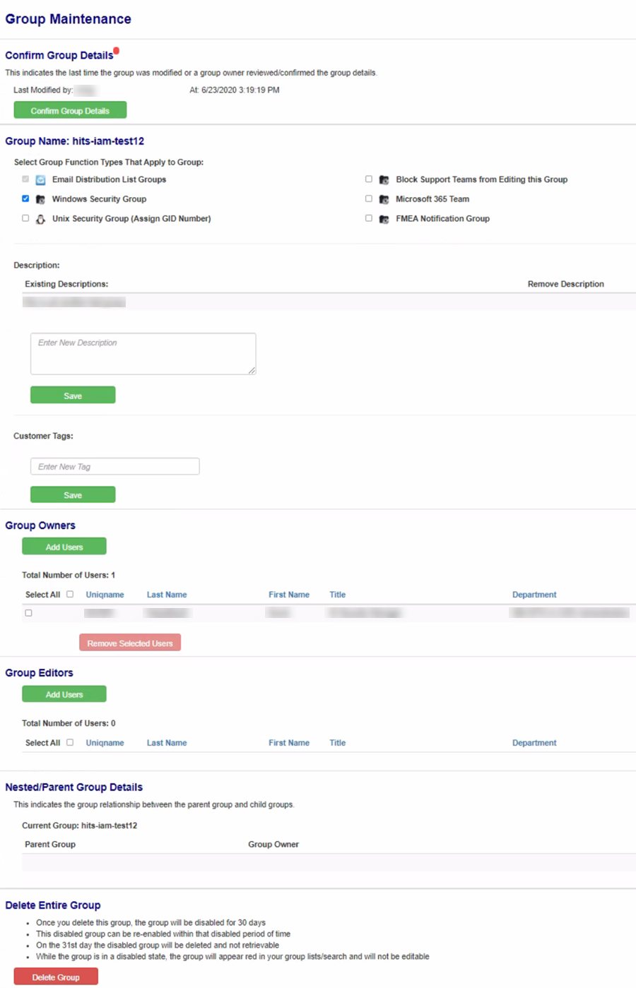 In the Search Results screen, clicking Edit Group will bring up the Group Maintenance screen (pictured below).