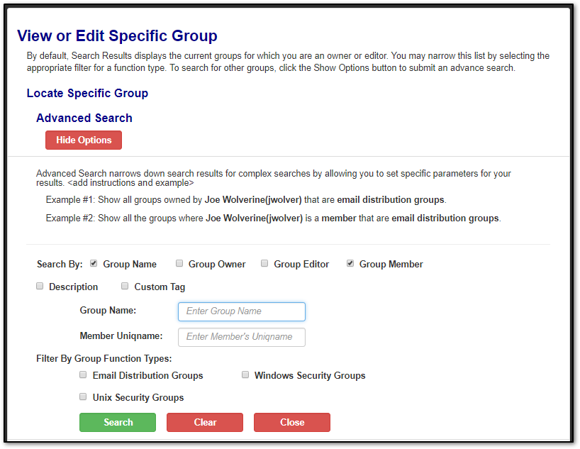 For each of these search fields, combining more than one search selection narrows the results. For example, searching Group Owner AND Description will produce results that only contain matches to both values provided. When searching with Group Type, it is best to search with only one selected, since combining fields will only display results that meet all conditions.