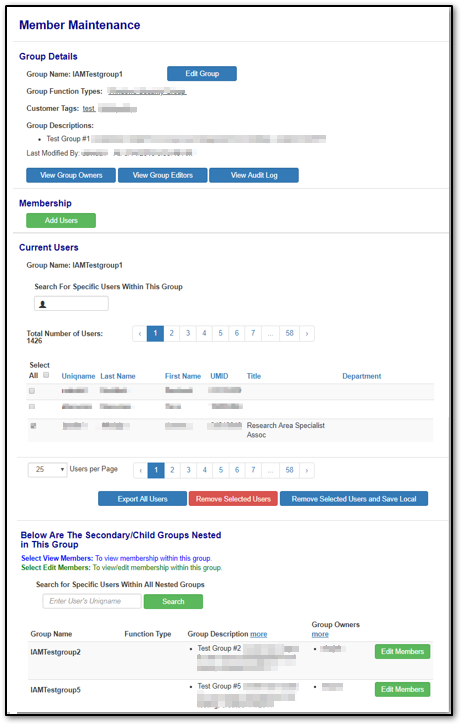 This screen allows you to perform maintenance on group membership, including the following functions: Edit Group, View Group Owners, View Group Editors, View Audit Log, Add Users, Export Users, Remove Selected Users, and Remove Selected Users, and Save Local. At the bottom of the function list are Secondary Groups that are nested within this parent group.