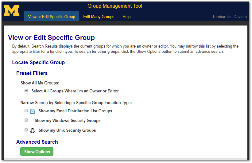 For a search with the preset filters, under the Locate Specific Group section, click Select All Groups Where I'm an Owner or Editor. If this box is not selected, the tool will still narrow search results to groups in which you are Owner or Editor.
