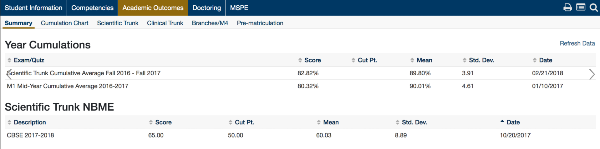 - Scientific Trunk NBME outcomes display on the Academic Outcomes tab on the Summary Page.