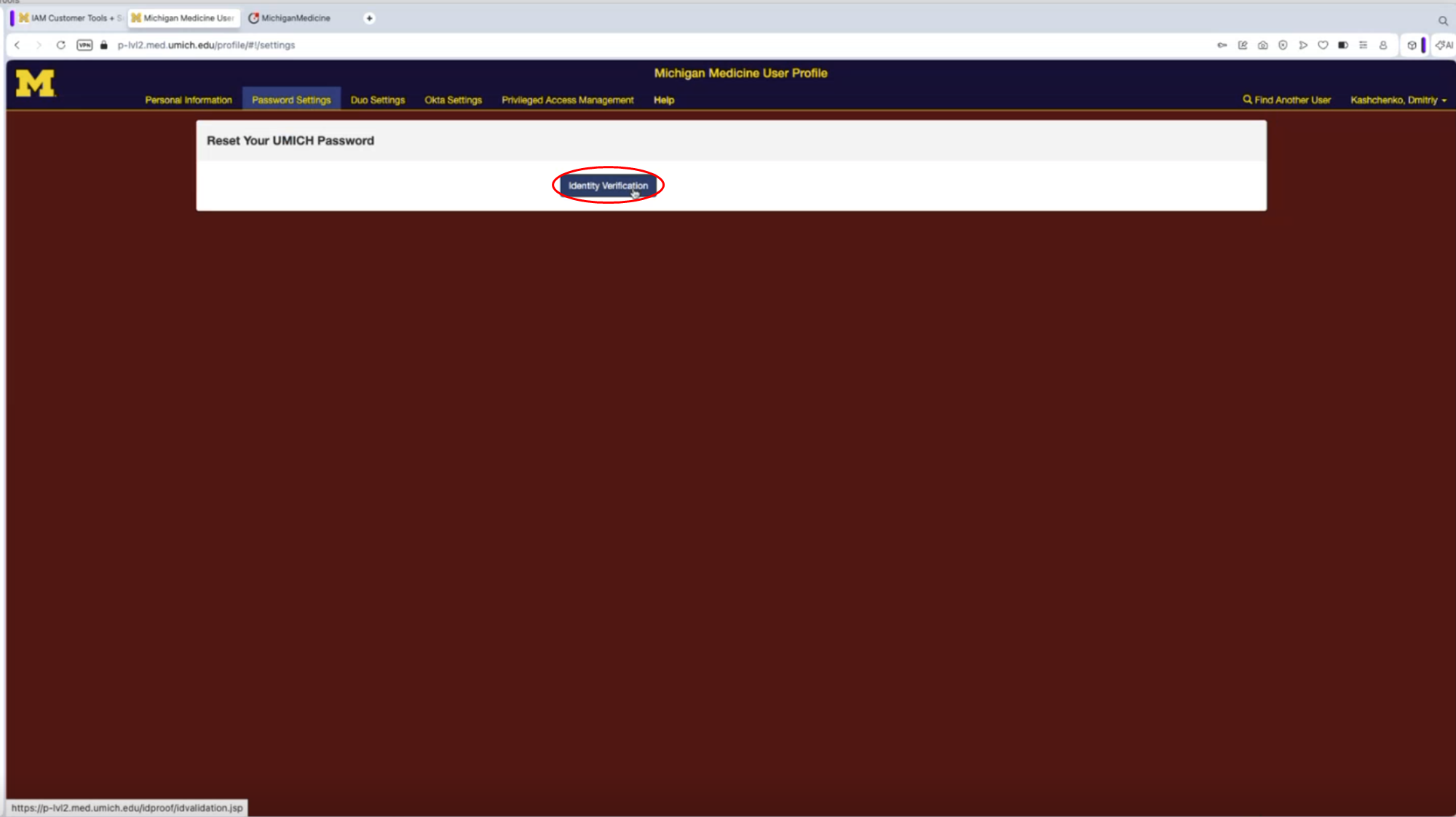 1. To reset your Michigan Medicine (Level-2) password, click Password Settings, then on Identity Verification.