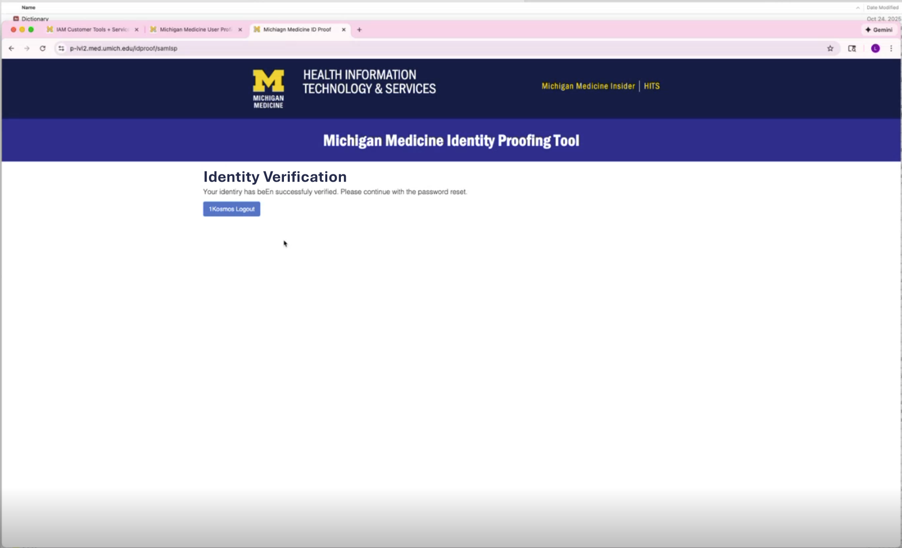 6. On the Michigan Medicine Identity Proofing Tool Identity Validation page, click on 1Kosmos Logout to display the Michigan Medicine User Profile Reset Your UMICH Password page.
