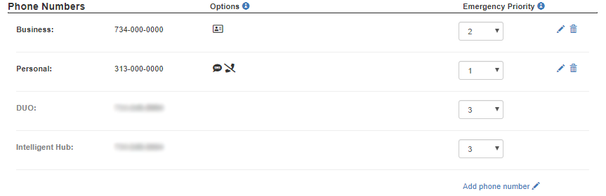 Your Duo phone number is set to Emergency Priority 1. You can change this value by setting the Emergency Priority to 1 on a different phone number. If you have multiple phone numbers, you can also manually rank them as 1, 2, 3, etc.