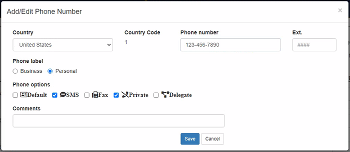 Phone options When editing or adding new phone numbers, select the applicable functionality for the phone number.