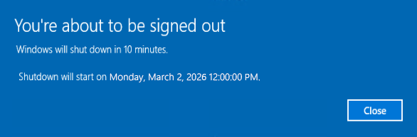 - The notification informs you that you'll be signed out of Windows and your device will shut down