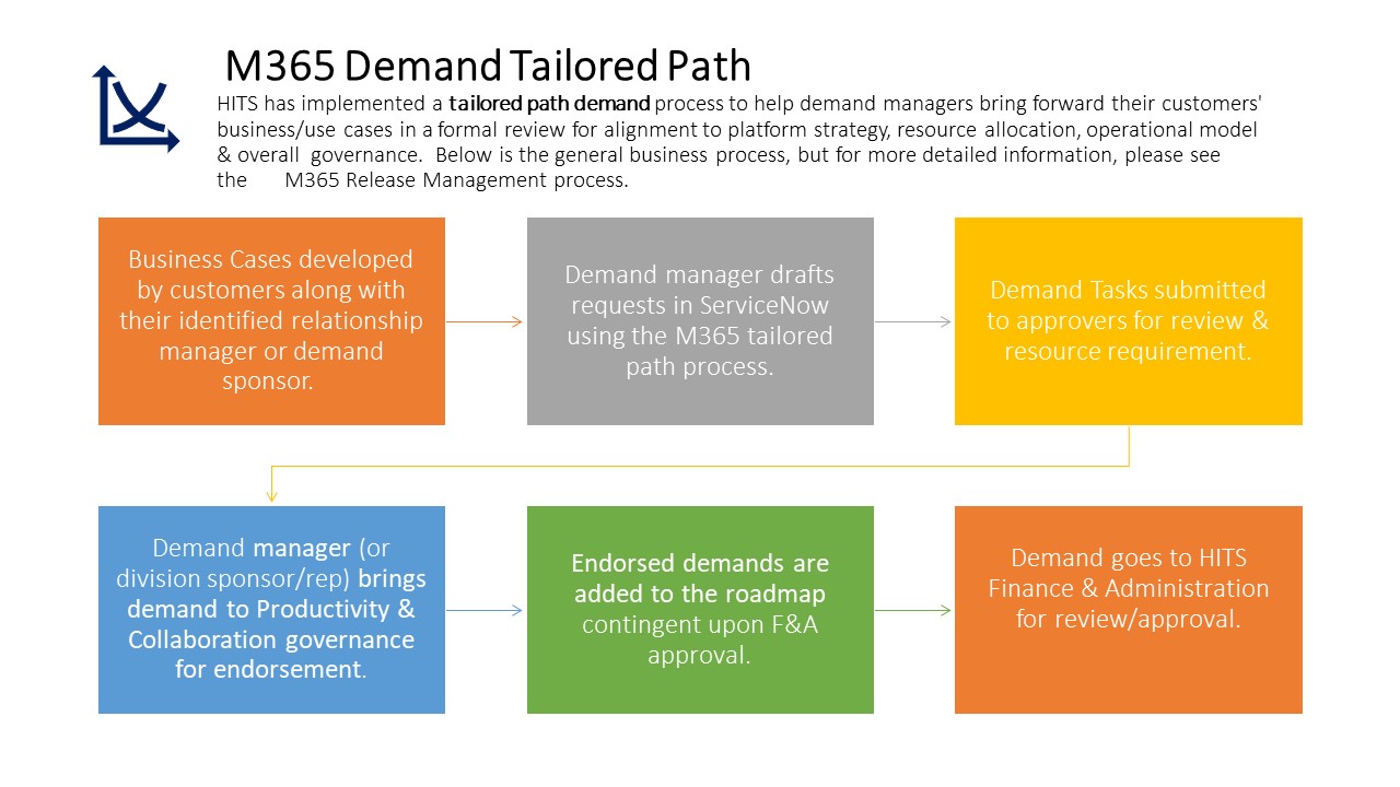 Microsoft 365 (M365) is Michigan Medicine's strategic platform for productivity, collaboration, & communication. HITS is accountable for the overall M365 platform delivery strategy which includes defining the roadmap to meet the strategic goals of Michigan Medicine. There are two ways for you to influence this roadmap using the ideas portal or demand management.