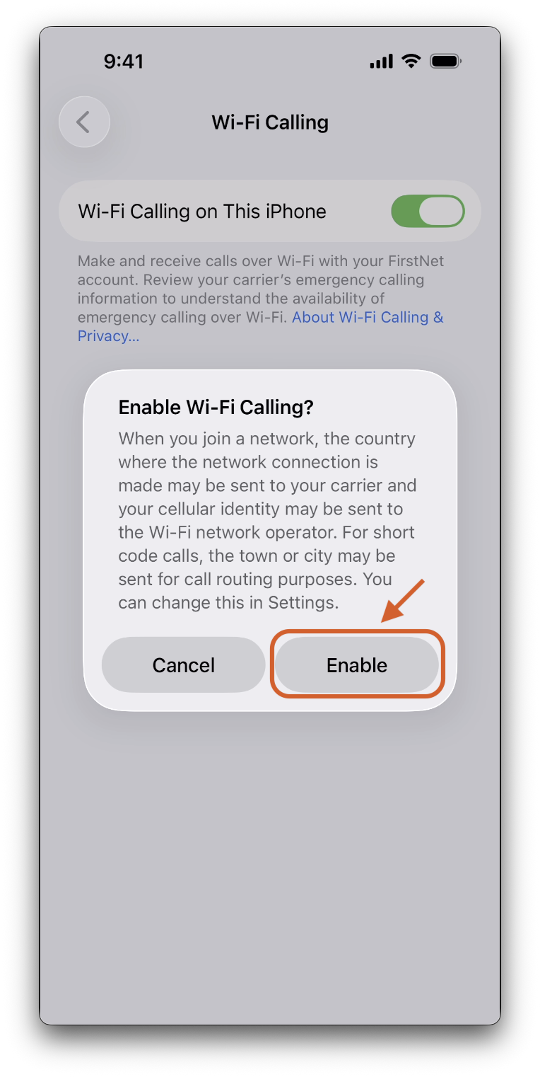 Note: If this is the first time you've enabled Wi-Fi calling on this phone, you may be prompted to update your emergency contact information by your cellular provider.