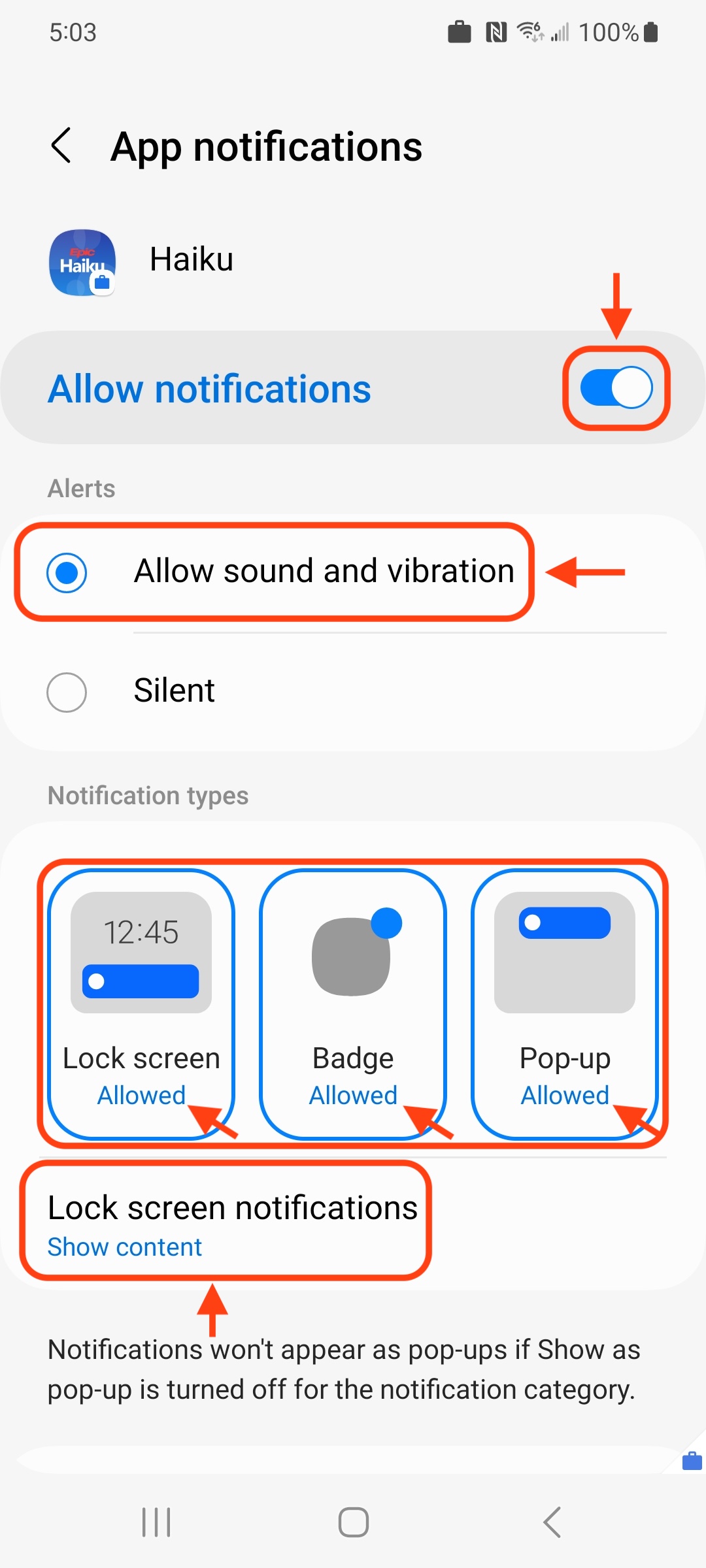 Under Notification Types set the Lock screen, Badge, and Pop-up options to Allowed