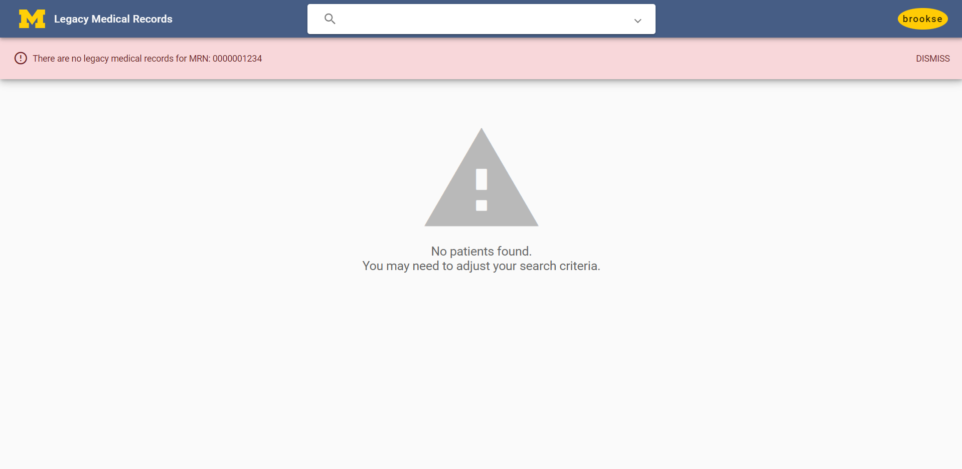 Many patients in MiChart will not have any legacy data in LMR. When LMR is launched for such a patient, LMR will display an error message explaining that no legacy medical records exist for the referenced MRN.