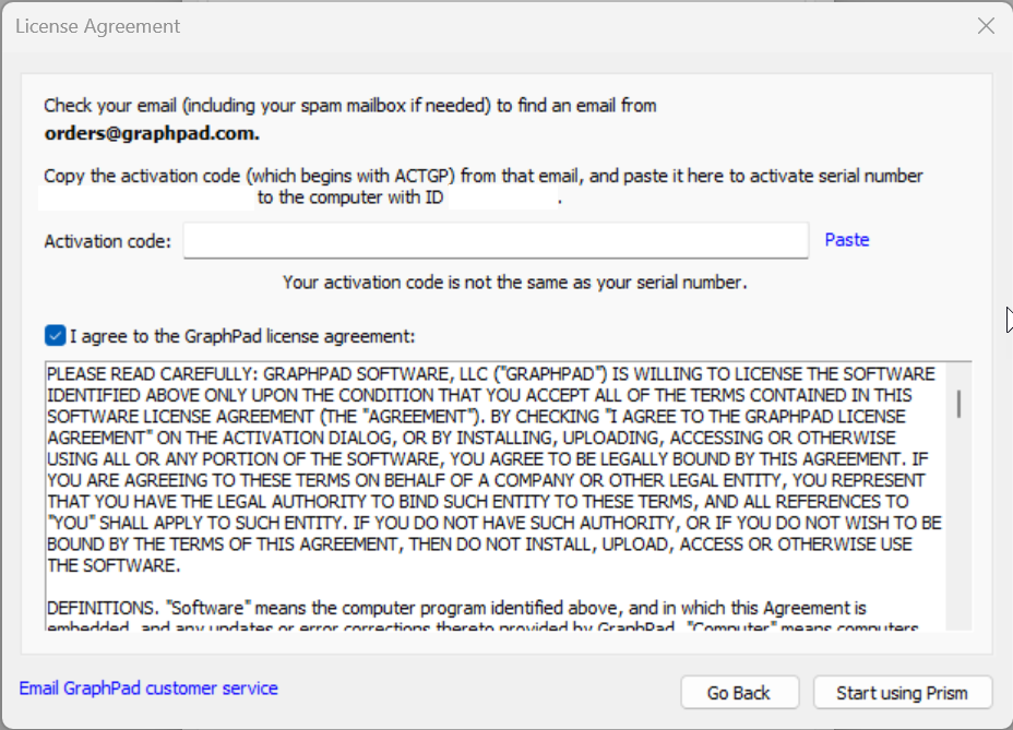 - Enter your code and agree to the GraphPad license agreement