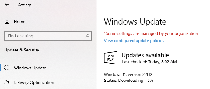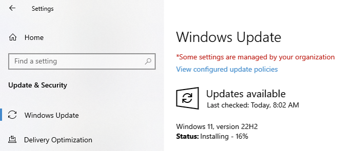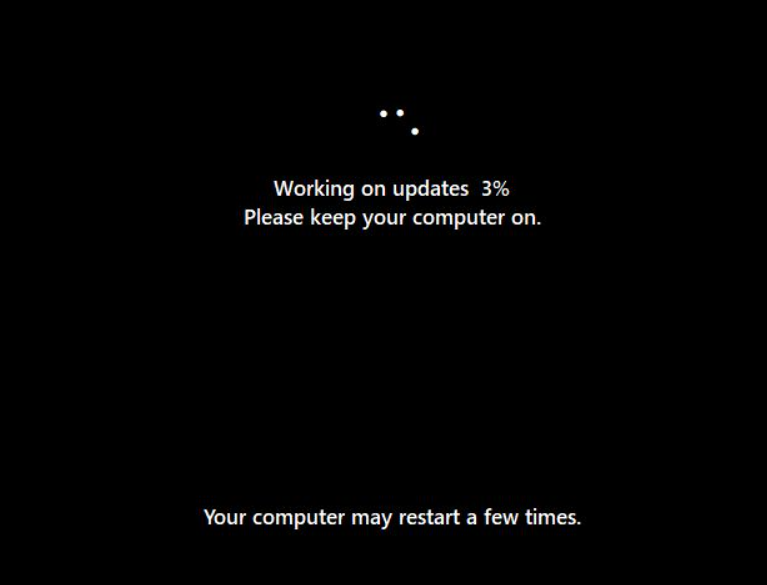 Once the device receives its policy from Intune to upgrade Windows, the upgrade will begin in the background. Users may not even notice it is happening. The following screenshots from the Windows Update portion of the Settings application show the four phases of the upgrade: Downloading, Online Upgrade, Pending Reboot, and Offline Upgrade. The Downloading and Online Upgrade phases occur automatically and in the background. Only when the Online Upgrade phase completes is the user notified and requested to take action. The Offline Upgrade phase may take over 30 minutes to complete. This process is the same for both Intune Shared Mode and Intune Assigned Mode.