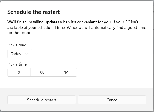 Note that you can choose to restart now or schedule a time when rebooting the device is more convenient.
