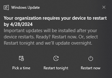Windows will also show a notification informing you of the impending reboot in three days and give you options to restart now or at a more convenient time.