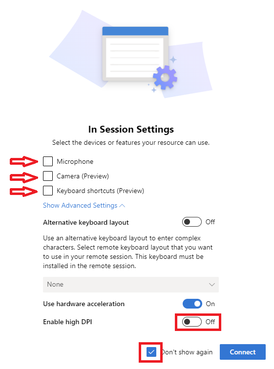 Remember that Teams meetings (audio and video) are not supported when using a web browser to connect to WVD. If you want to participate in Teams meetings, use the Windows App (for Mac or Windows). - Click Connect.