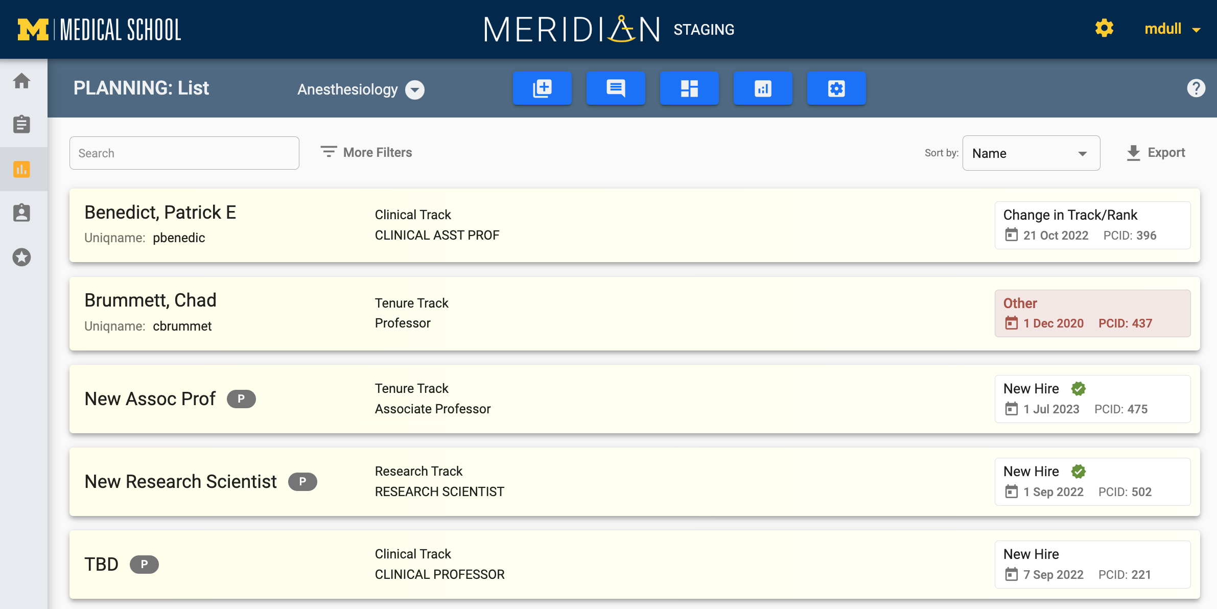 The Planning area within Meridian allows U-M Medical School departments to communicate their faculty plans (planned new hires, departures, promotions, retentions, etc.) broadly to Michigan Medicine leadership.
