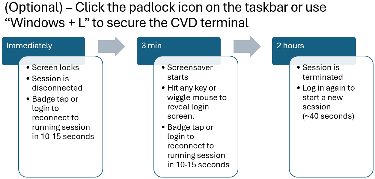 After 3 minutes of inactivity the screensaver will start. After an additional 12 minutes (15 total), the CVD terminal will lock and disconnect your CVD session. Your CVD session will remain running in the cloud for 2 hours after your session is disconnected. You can secure a terminal at any time by clicking on the padlock on the taskbar or with a badge-tap. Unlocking a terminal and reconnecting to your session should take 10-15 seconds.