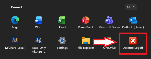When you are in your CVD session, use the red-X in the start menu to logout. Even though your session will automatically log out after two hours of inactivity, logging out when you are done helps conserve Michigan Medicine resources and release locks on any files you may have left open.