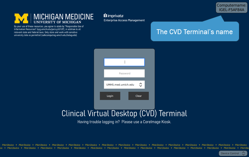 Open tickets like you would for a CoreImage Kiosk computer. Inform Service Desk that you are using Clinical Virtual Desktop. The computer's name will be changed to start with "IGEL" instead of WS or LT. The name of the CVD Terminal will be on the physical computer label and on the login screen as shown below.