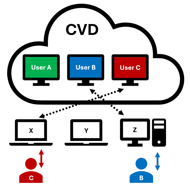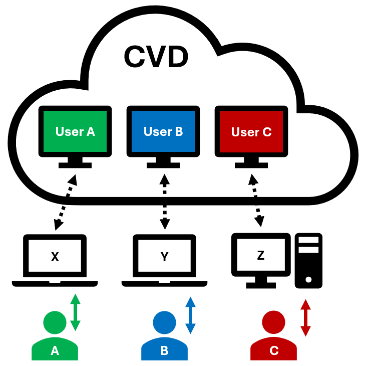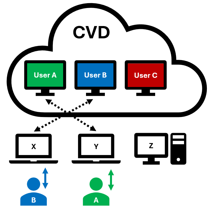 - CVD Session: The user's Windows desktop running on a CVD host that roams with them as they move from one CVD terminal to the next.
