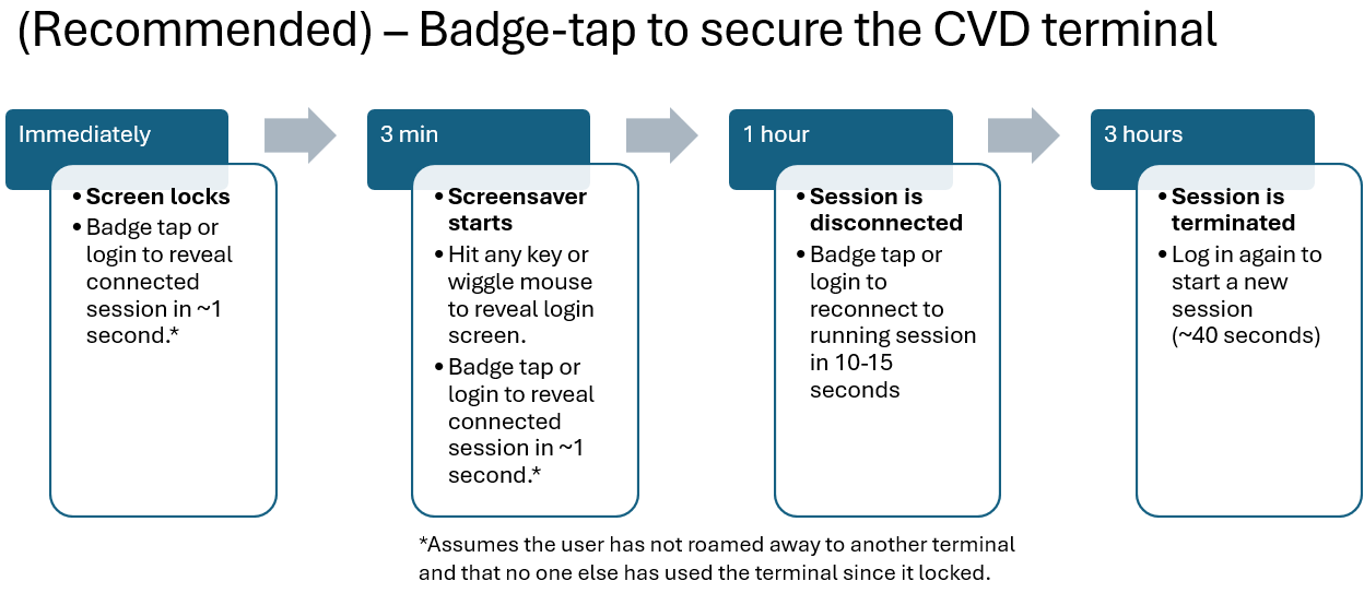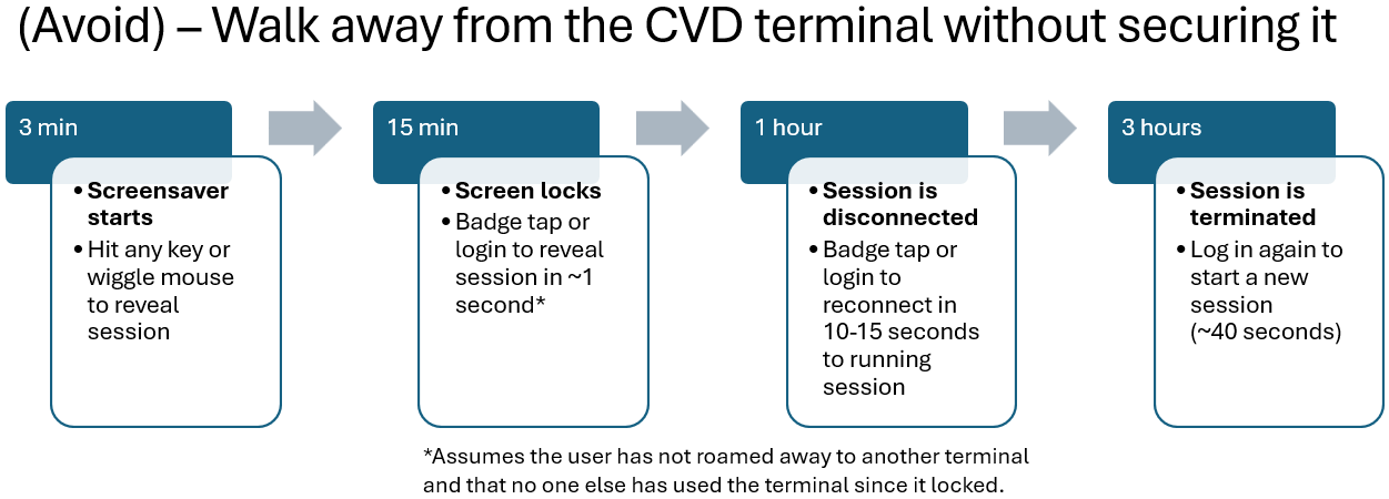 Anyone walking up to an unsecured terminal will be able to use your session. If someone walks up to the unsecured CVD terminal you walked away from, instead of using your session they should badge-tap to roam their CVD session to the terminal which will disconnect your session. Alternatively, if you leave your CVD session unsecured on one terminal and start to use a second CVD terminal, your session will disconnect from the first terminal and appear on the second--even if someone is actively (and inappropriately) using your session on the first terminal.