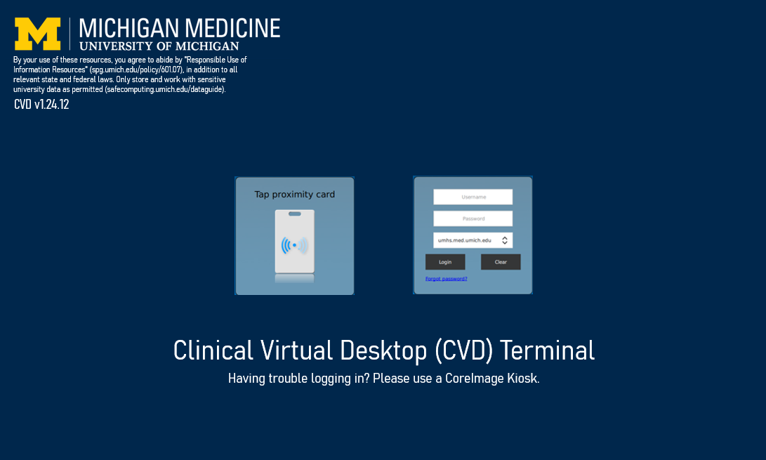 - Clinical Virtual Desktop (CVD): Michigan Medicine's internal brand name for the technologies that are combined to deliver a clinically focused version of WVD to replace many CoreImage Kiosks.