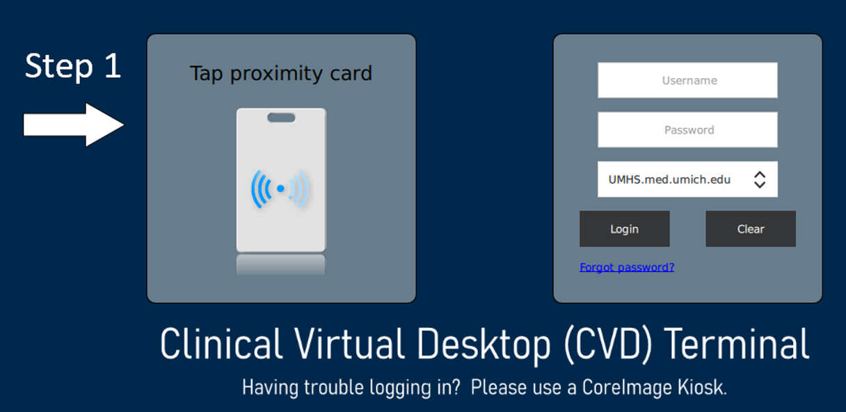 To access your CVD session, you can login to the CVD terminal or tap your badge. The first login of the day will take about 40 seconds as a new CVD session is created for you. Subsequent connections to that CVD session will take 10-15 seconds. If you don’t access your CVD session for over two hours after your session disconnects from a CVD terminal, your initial session will end, and you will need to start a new session. Any customizations such as wallpaper, files on your desktop, Outlook settings, and more will persist from one CVD session to another. CVD will automatically log you into numerous applications, such as MiChart, Outlook, Edge, and your network drives.