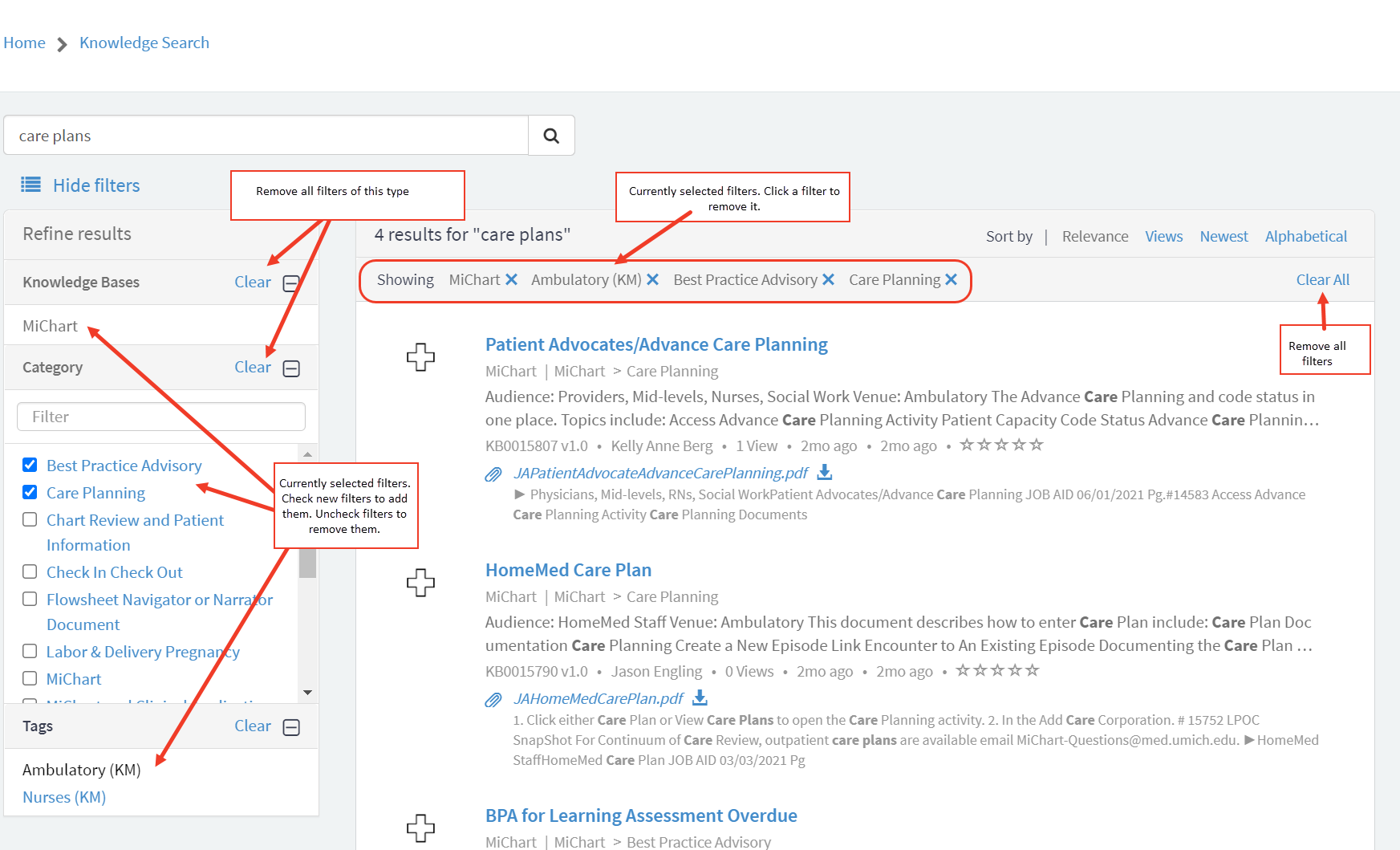 - To remove Knowledge Base or Tag filters - click Clear at the top of that filter section or click the filter name in the Showing line