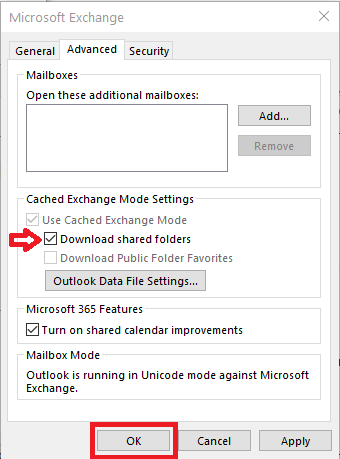 NOTE: the larger the time window, the greater amount of disk space you will consume. This setting will not only download items from the shared resources library but your own as well. Only slide it to the window of time you want to be able to search shared resources' mailboxes. - Click More Settings