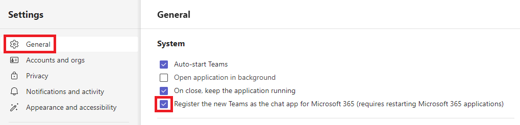 - Check the "Register the new Teams as the chat app for Microsoft 365" option and close the settings window.
