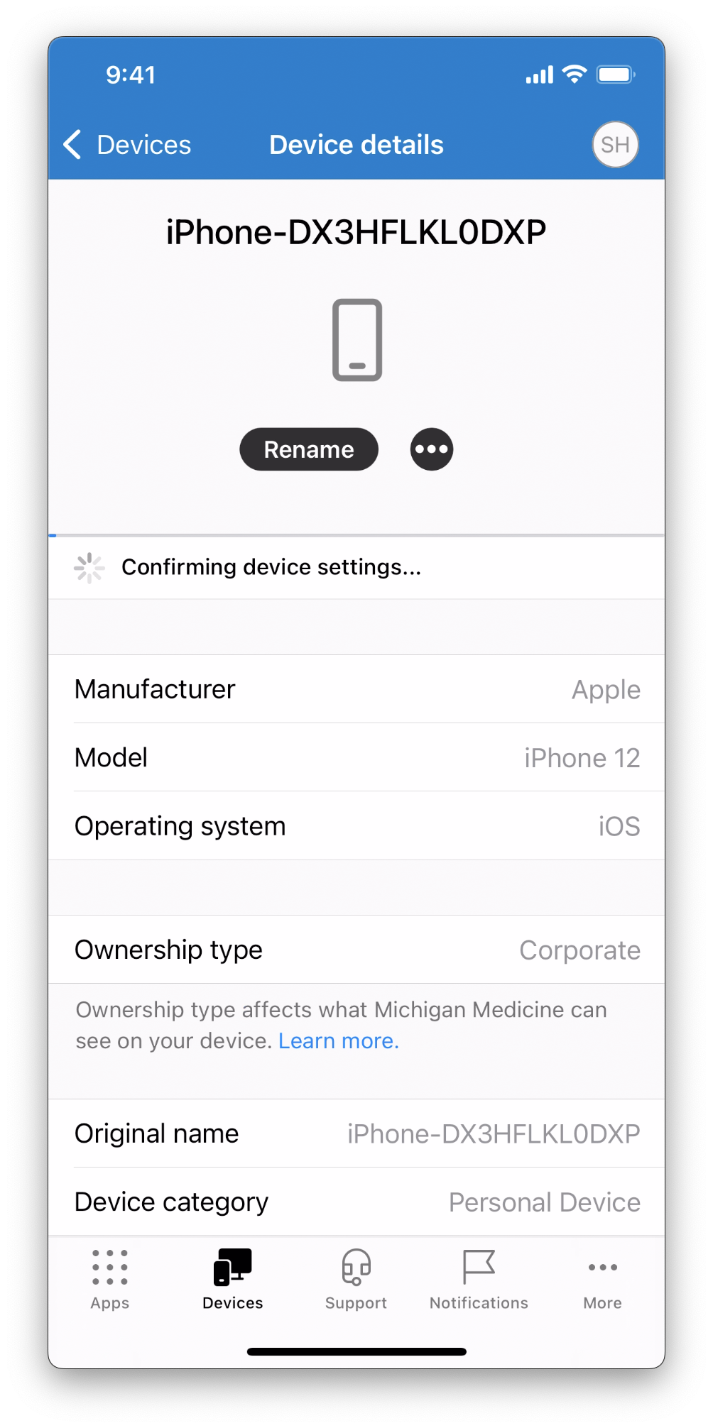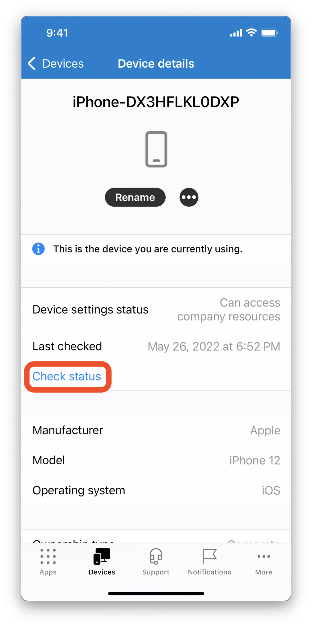 1. Open Company Portal, navigate to the Devices tab, then select the device you are currently using.