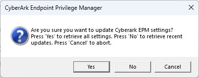 If you do not see a date and time, then the agent has not yet communicated with the CyberArk service. You may force the agent to check-in by right-clicking on the EPM agent's icon in the system tray and choose "Request Settings." Select Yes in the window that appears. After a few moments, the check-in will complete, and you can recheck the date and time. At this point you have validated that the EPM agent and the CyberArk service are communicating and can proceed to request privileged access.