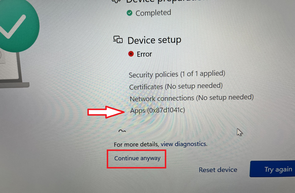 - If you see a failure during the enrollment due to an application not installing, click "Continue anyway" instead of "Try again."