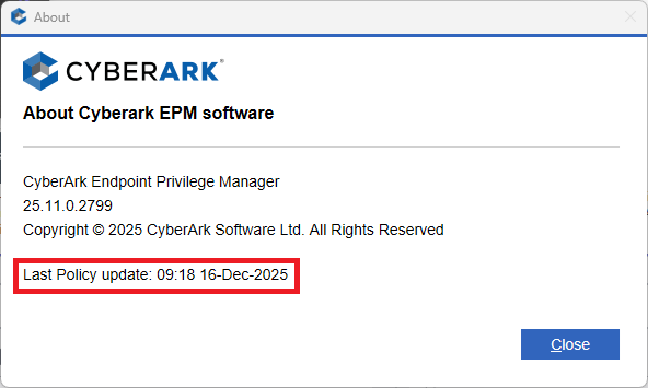 If you just received your Intune-CoreImage device and have logged in for the first time, please wait up to two hours for the EPM agent to install. Once it installs, it will automatically start. You can review the last time it checked in with the CyberArk service by right-clicking on the icon above and choosing "About CyberArk EPM Agent." Note the date and time for the last policy update as highlighted in the following screenshot. If you see a date and time, then the agent is communicating with the CyberArk service.