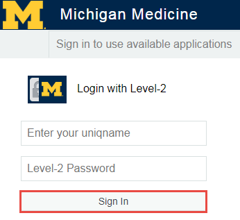 Type your Uniqname and Michigan Medicine (Level-2) password, click Sign In, and complete authentication through Duo.