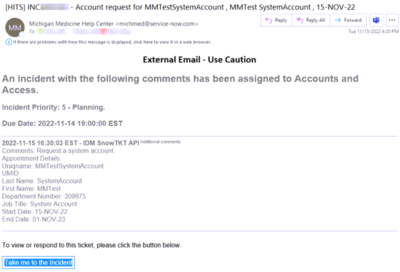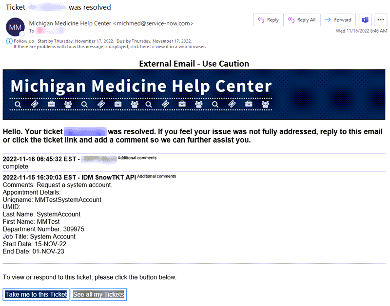 After submission, a ServiceNow ticket will be created and you will receive an email from michmed@service-now.com with details about your request.