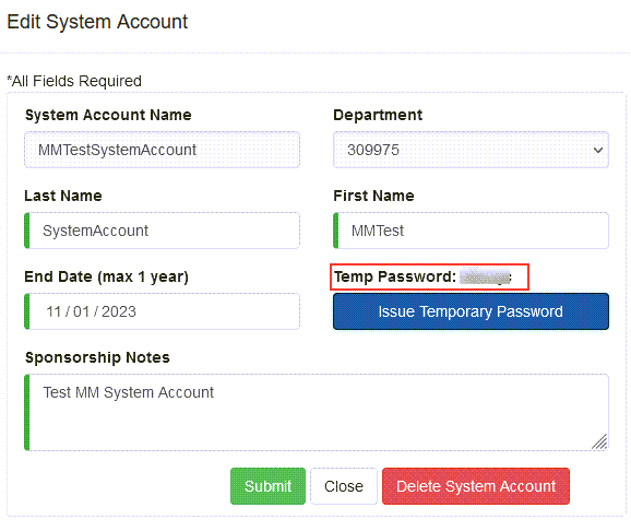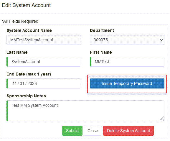 2. You can edit, First Name, Last Name, End Date, no greater than 1 year max, and the sponsorship notes. You can also assign a temporary password. If resetting a password to a system account, it is important to note that all resources that use this account will need to have their passwords updated.