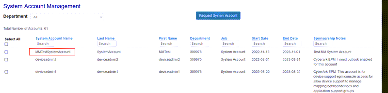 This page is where a System Account Liaison can view, edit, export, and delete system accounts associated with a specific department.