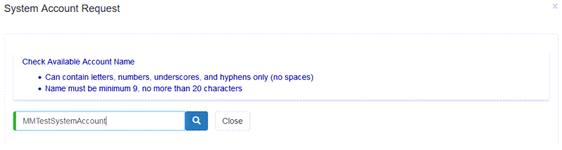 - Enter your desired system account name and click the search button (this will check to see if your desired system account name is available).