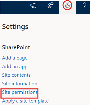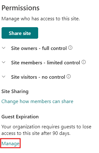 - Or, from the gear icon (site settings), select Site Permissions. Then, from the Permissions window, select Manage (under Guest Expiration)
