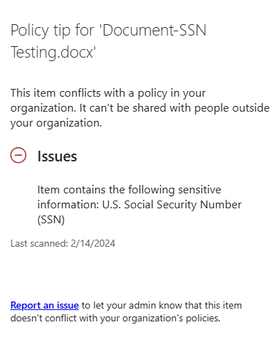 In OneDrive for Business and SharePoint Online, as a user you may share files and documents with internal and external users. However, based on our organizational settings you might violate corporate policy with the resulting action being a notification or blocking of your documents / files from being shared externally.