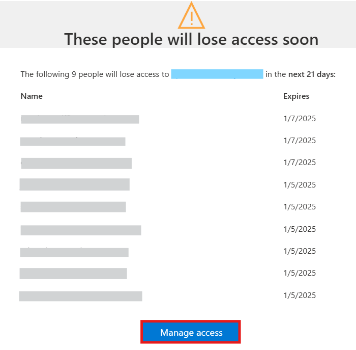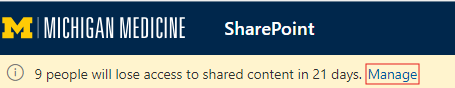 External user access expires after 90 days. This is a Michigan Medicine tenant level setting. Once external users reach their assigned expiration date, they'll lose access to the shared content. The external user's access can be extended prior to their expiration date, or they can be re-invited if their access has expired.