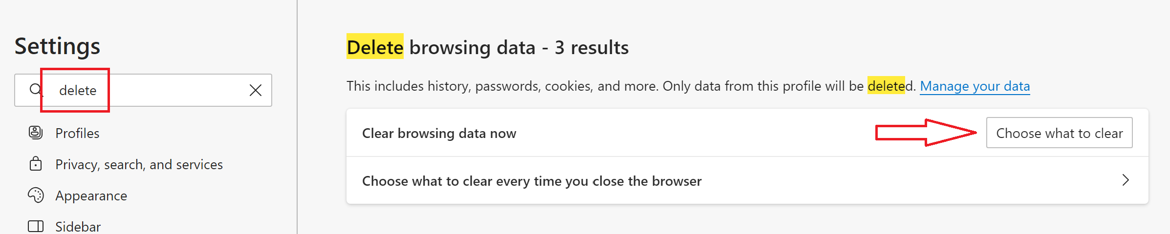 - Search for delete and click either Choose what to clear (in Edge) or Delete browsing data (in Chrome). The following shows the Edge interface.