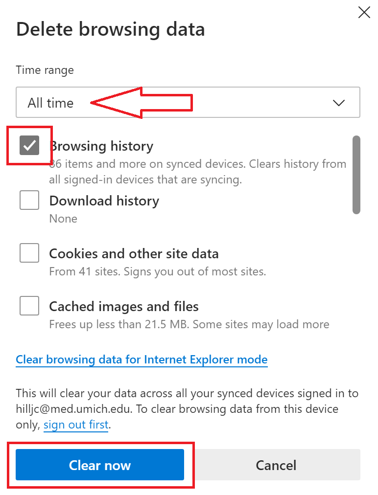- Select All Time, check History, and Clear now (in Edge) or Delete data (in Chrome).