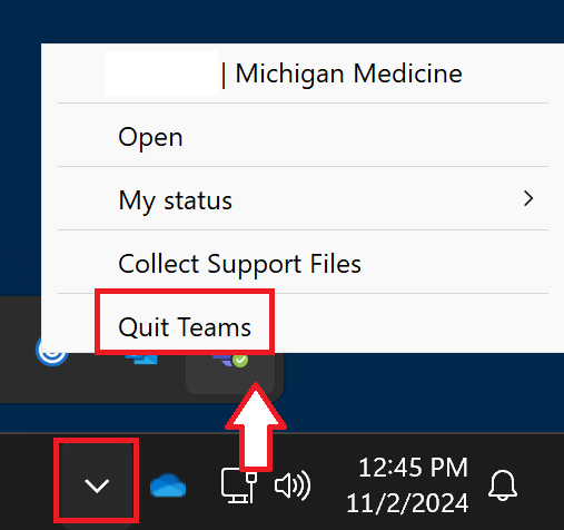 - Quit Teams by clicking on the ^ arrow in the taskbar then right-click on the Teams icon and click Quit Teams.